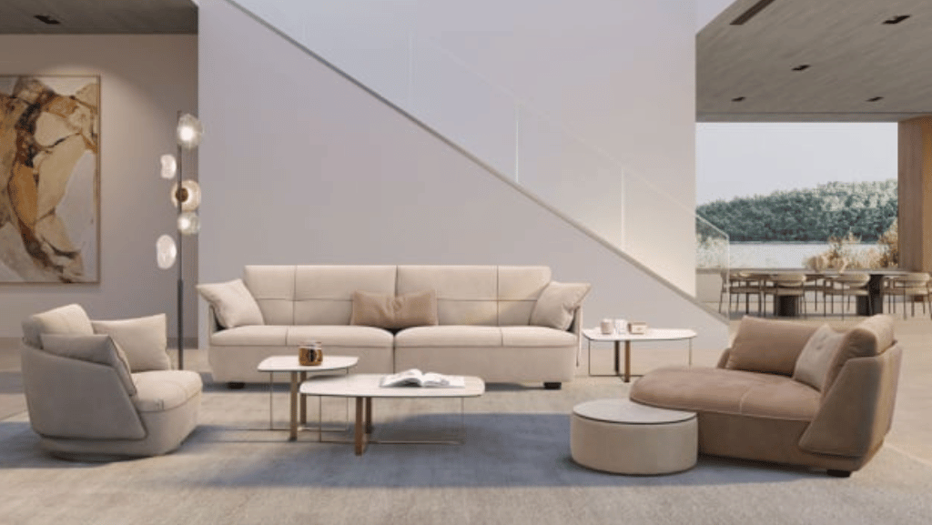 Many people choose warm tones for large furniture, such as a contemporary sofa. These models often feature low backs, modular designs, and clean lines. Warm neutrals let these forms stand out without making the room feel busy. They also go well with trendy curved coffee tables, abstract rugs, and mixed lighting.